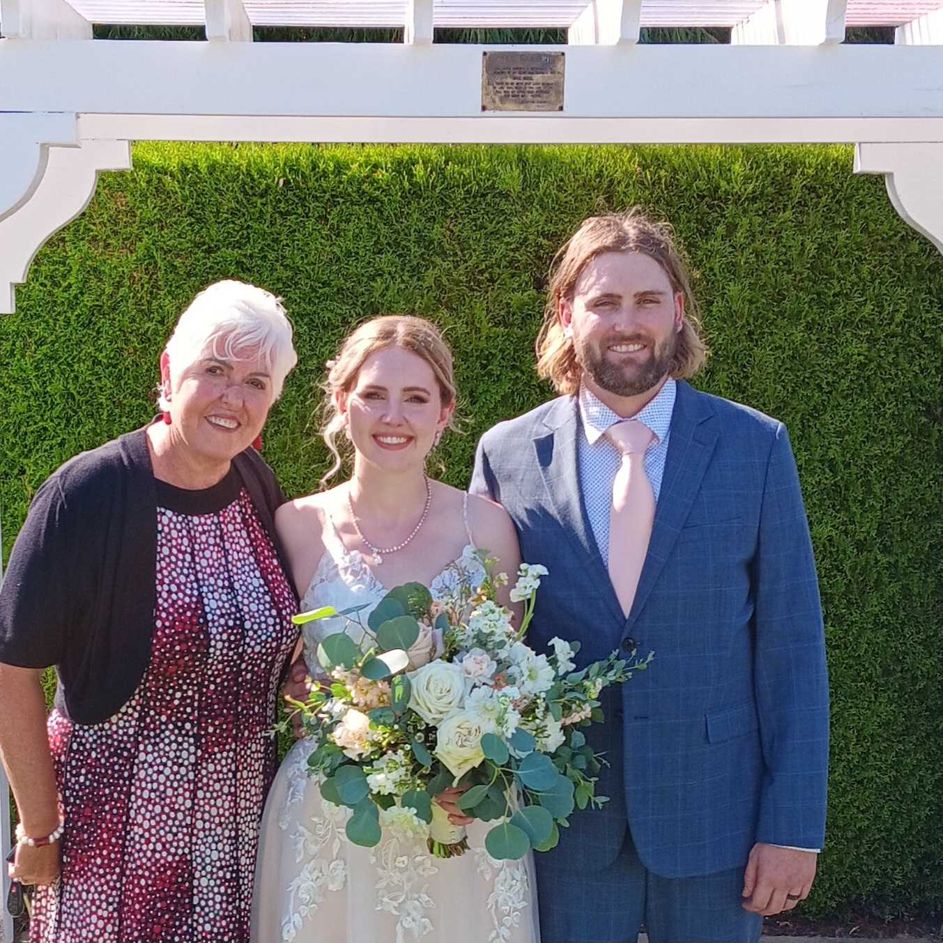On July 21, 2023, Michelle and Jeff exchanged their vows at the Langely Golf Club in a beautiful outdoor “chapel”. Jeff is from Australia and his family and many friends arrived for this festive occasion. The bride was stunning in a full length gown with a small train and her bouquet was perfect with pale off-white roses. Many, many good wishes to this couple as they travel the road of married life together.