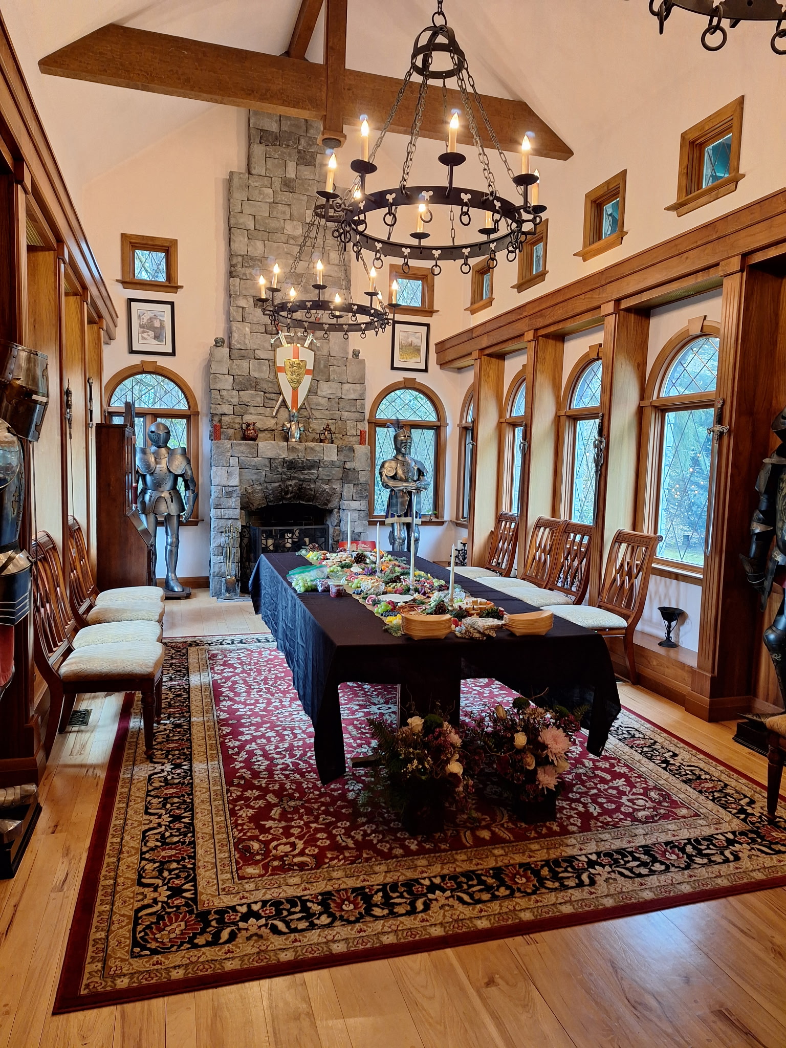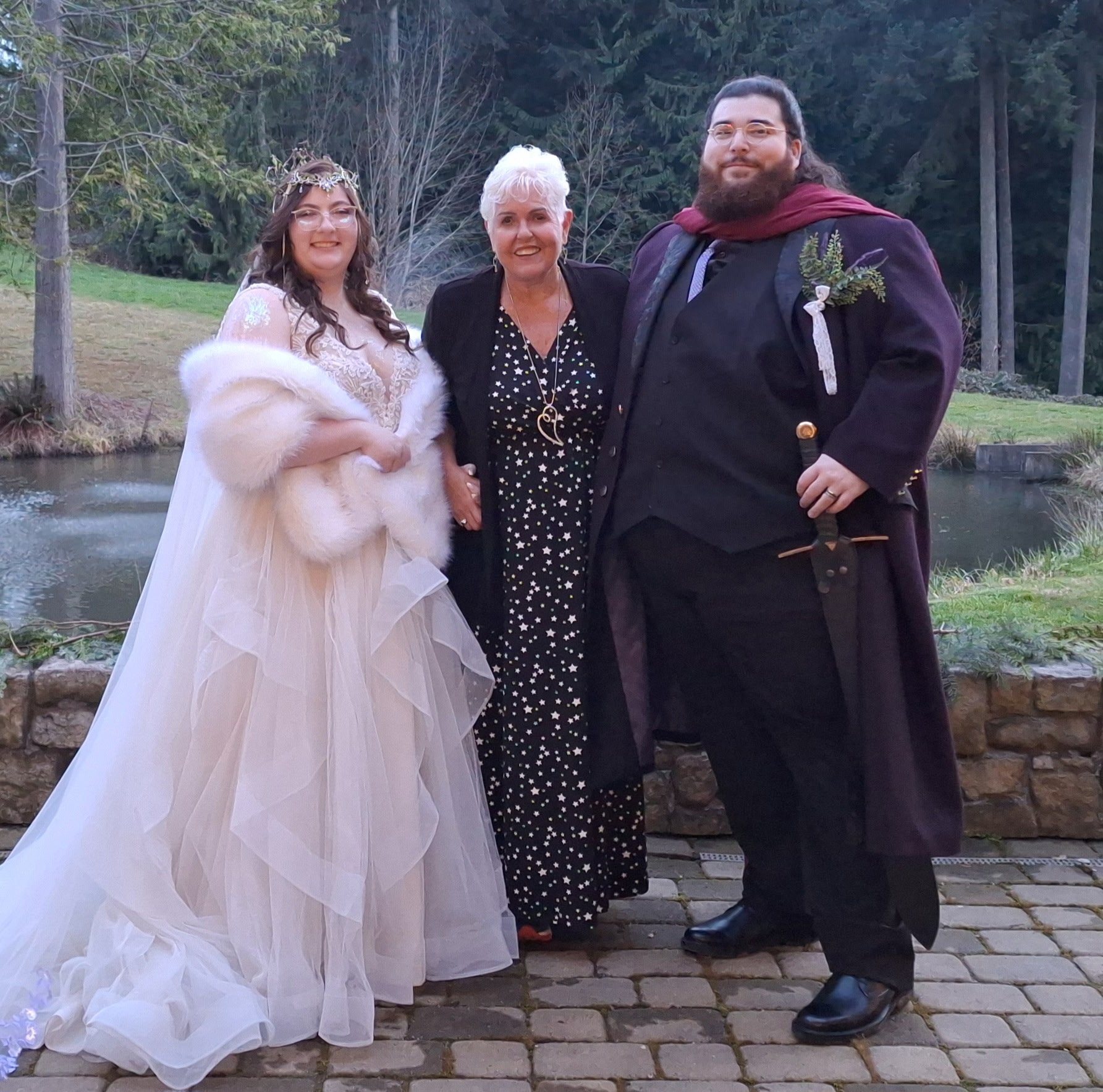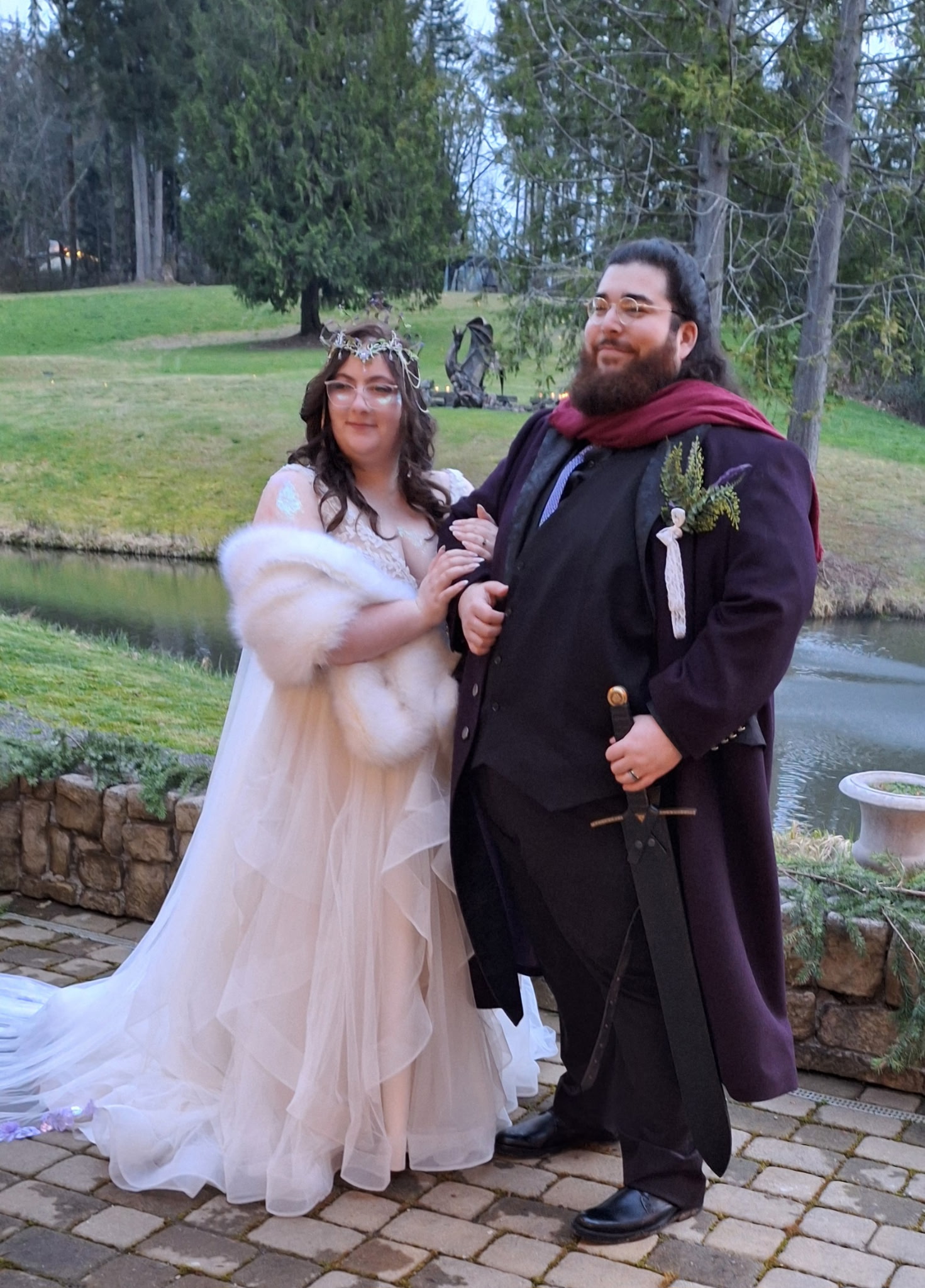 On March 22, 2025 (the Spring Equinox), Nick and Cassie said their “I do’s” at High Rock Castle. The Castle was built in 1997 and recreated as a 1500’s castle including suits of armor and deer and elk heads in the dining hall, in Monroe Washington with 50 guests in attendance. The theme of their wedding was dungeons and dragons and many of their guests were in full costume. The bride stole the show with a stunning gown and white fur. Her groom wore a full tunic jacket with a mock sword at his side. Although it was chilly, the party continued outside under a canopy with cauldrons burning for warmth.